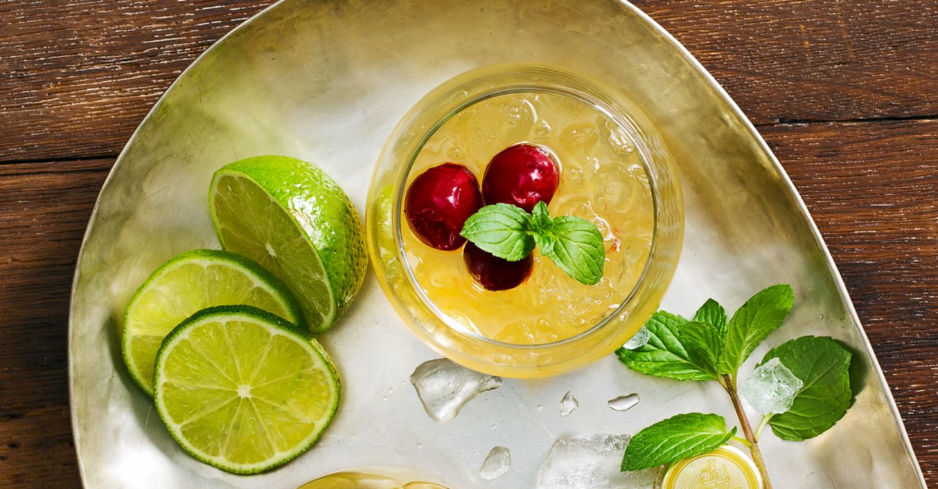Die Kirschen zugeben und mit der Limettenscheibe und dem Minzzweig garnieren.