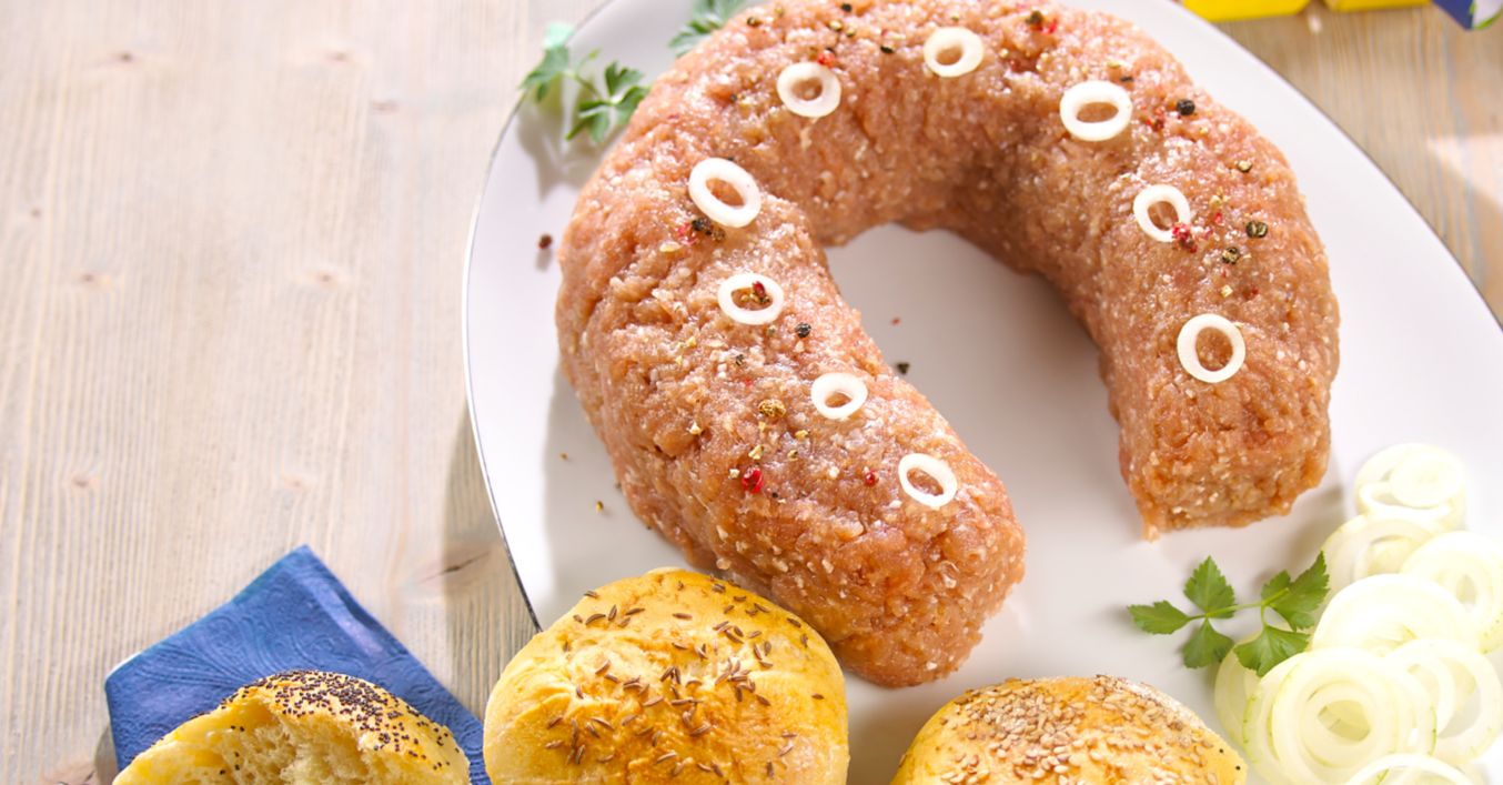 Mett-Hufeisen mit Brötchen und restlichen Zwiebelringen servieren.