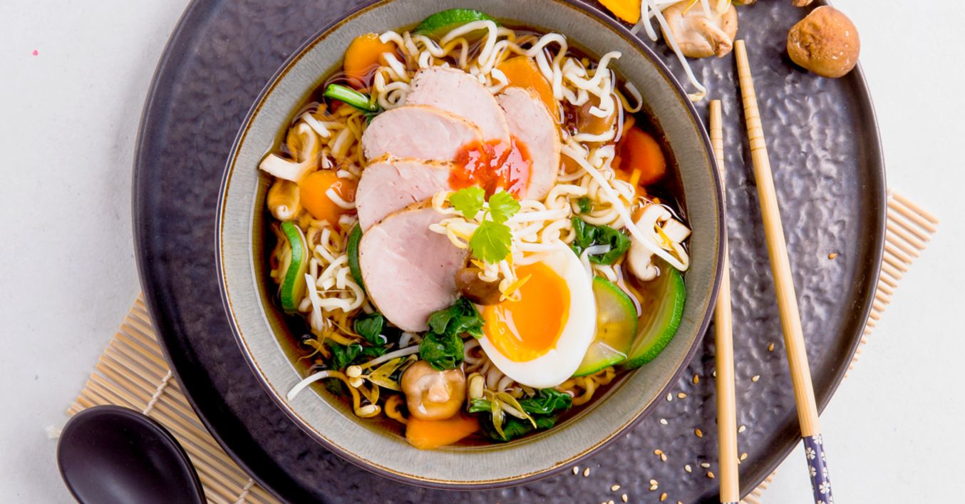 Die Mie-Nudeln auf vier große Schalen verteilen und mit der kochenden Suppe bedecken. Schweinefilet in dünne Scheiben schneiden und auf den Nudeln gleichmäßig verteilen. Die Suppe mit je einem halben Ei garniert servieren.