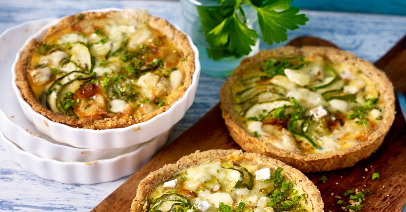 Den Teig zwischen Folie circa 5 Millimeter dick ausrollen und den Boden und Rand von 8 gefetteten Tartelettesförmchen (Durchmesser circa 10 Zentimeter) damit auslegen. Den Boden mit einer Gabel mehrfach einstechen, Zucchinischeiben fächerartig darauf anrichten, den Guss darauf verteilen und im vorgeheizten Backofen bei 180 Grad (Umluft: 160 Grad) 25 bis 35 Minuten goldbraun backen. Tartelettes mit Kräutern garnieren und servieren.