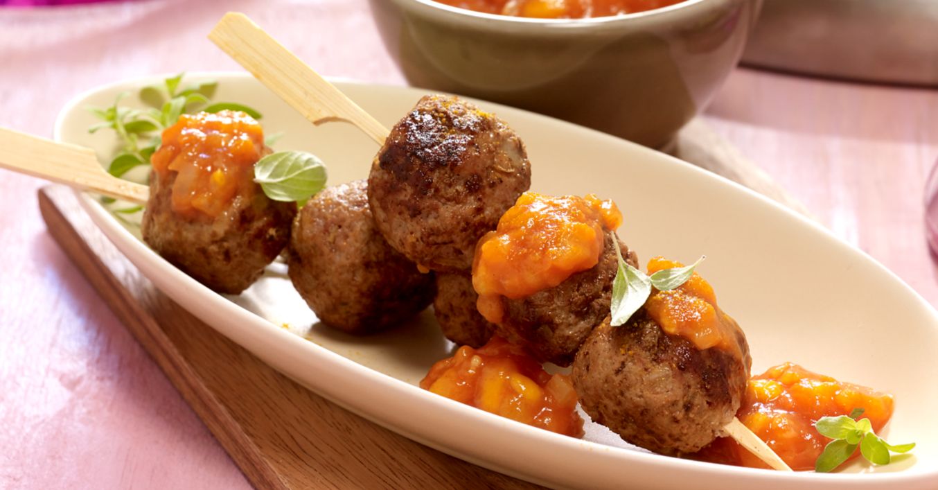 Mango zur Soße geben und circa 8 Minuten köcheln lassen. Hackfleisch mit restlichen Zwiebeln verkneten und mit Salz, Pfeffer und restlichem Currypulver würzen. Zu 24 kleinen Bällchen formen und im restlichen erhitzten Öl rundherum circa 5 Minuten braten.