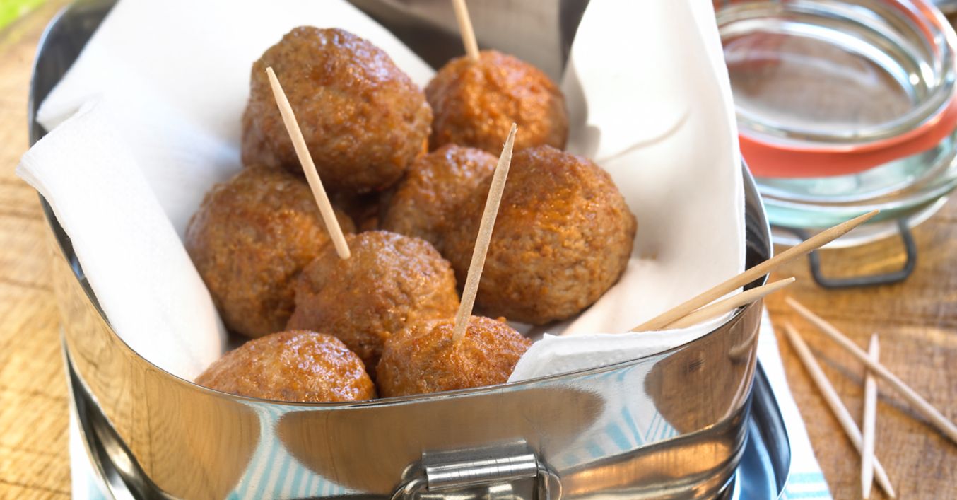 Mini-Frikadellen und Salsa separat verpacken und mitnehmen.