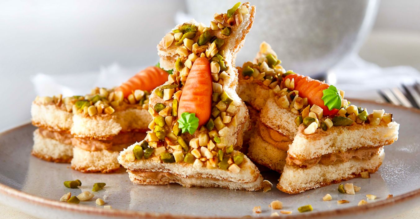 Hasentörtchen mit Pistazien und den gerösteten Mandeln bestreuen und mit je einem Marzipanrübli garnieren.