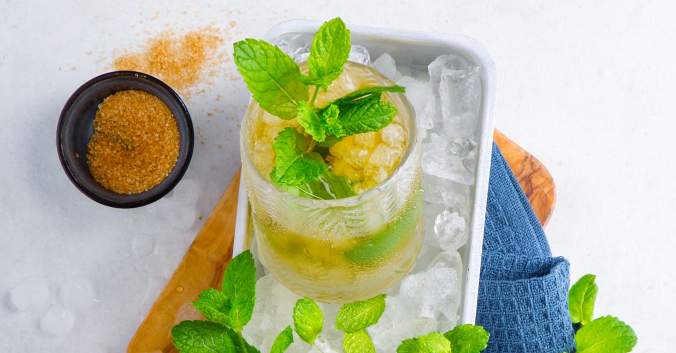 Sirup mit Minze und Eis in ein Glas geben und verrühren.
