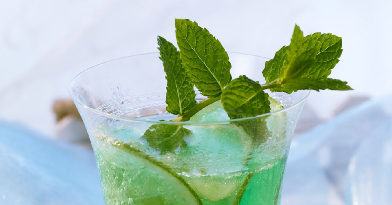 Pfefferminzlikör und Limetten in einem Bowlegefäß vermischen, Limetten mit einem Stößel etwas zerdrücken, Weintrauben hinzufügen und mit eiskaltem Mineralwasser aufgießen. Pfefferminzzweige einlegen und servieren.