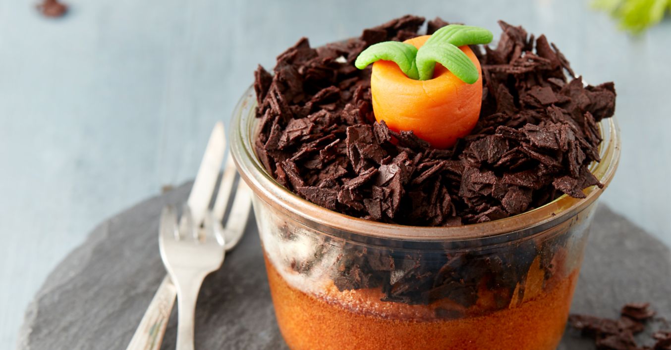 Schokoraspel mit Kakaopulver vermischen. Restliche Butter bei geringer Hitze schmelzen, zu der Schokoladen-Kakao-Mischung geben und gut untermischen. Mischung auf die Muffins geben und mit je 1 Marzipanmöhre dekorieren.