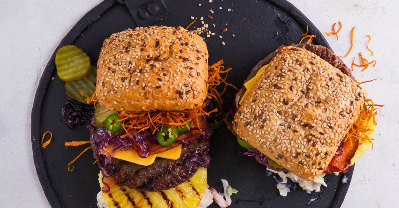 Tigerbrötchen halbieren, kurz anrösten und die Unterseiten mit Steaksoße bestreichen.Coleslaw und je ein Patty darauflegen, dann Käse, Bacon, Zwiebeln, Ananas, Jalapeños, Gurken und Möhren darauf verteilen.
