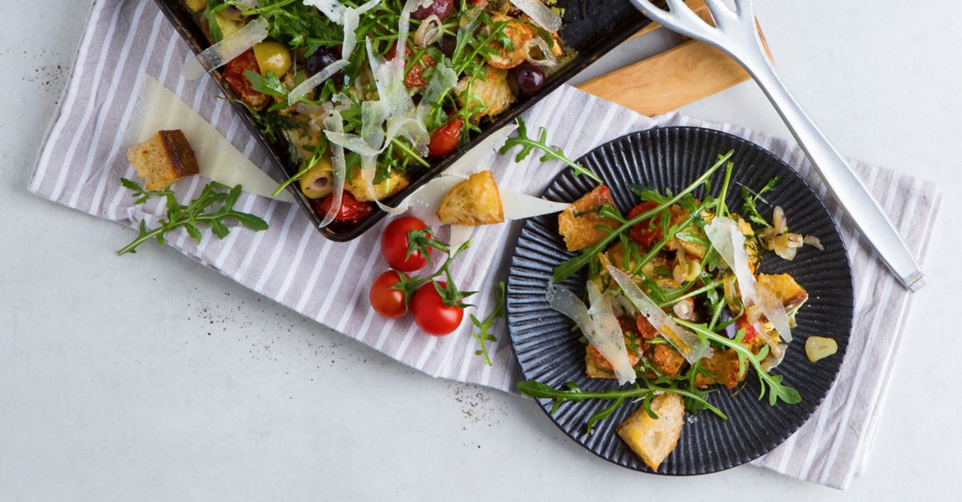Brotwürfel aus dem Ofen nehmen, mit 3/4 des Rucolas vermengen und mit den Kirschtomaten und Oliven in der ofenfesten Form verteilen. Mit den Eiern übergießen und im vorgeheizten Ofen circa 15 Minuten backen.