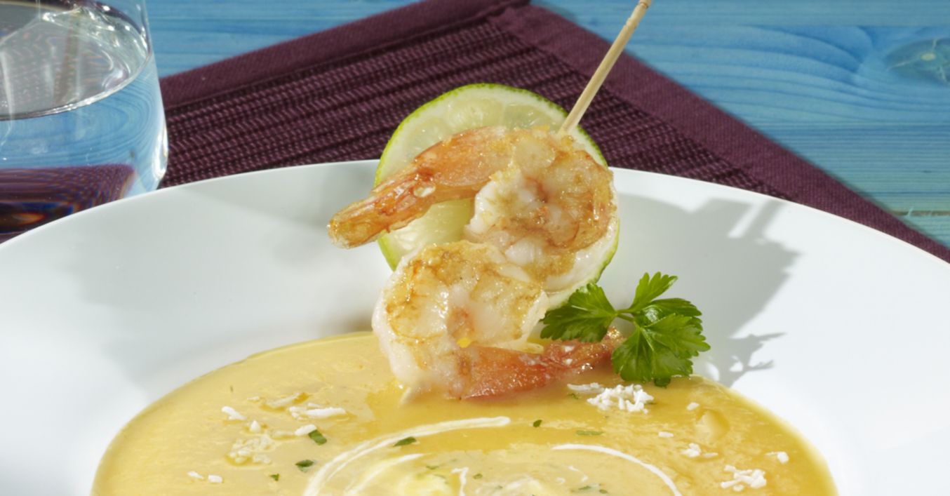 Garnelen waschen, trocken tupfen, mit Limettensaft beträufeln und mit etwas Salz würzen. Mit Mehl bestäuben und auf kleine Holzspieße reihen. Spieße in erhitztem Öl ca. 3-5 Minuten braten. Suppe in Bowls oder Suppenteller füllen, mit Koriander sowie Kokosraspeln bestreuen und mit den Spießen servieren.