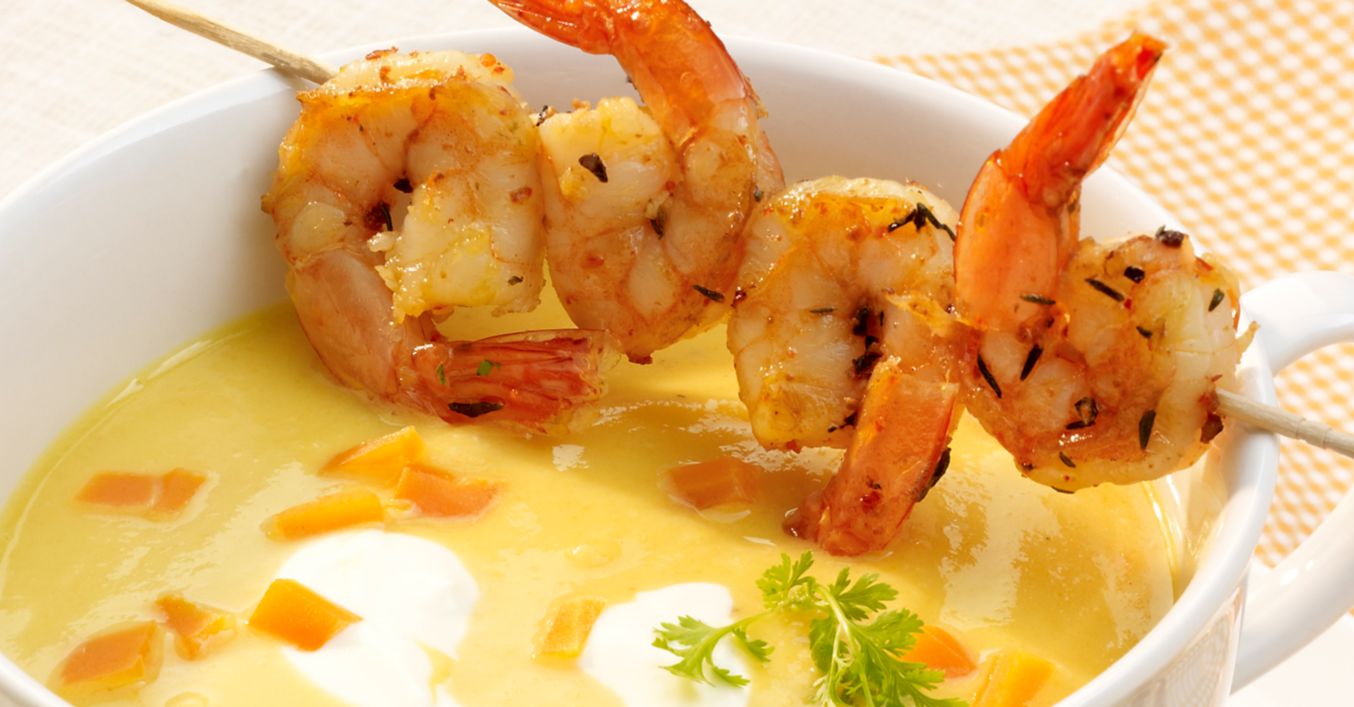 Suppe pürieren und mit Salz, Pfeffer und Currypulver abschmecken. Garnelen waschen, trocken tupfen, auf Holzspieße reihen und 3 bis 5 Minuten in restlichem erhitztem Öl braten. Suppe in Teller oder Tassen füllen und mit den Garnelenspießen servieren. Nach Wunsch die Suppe mit Crème fraîche und Koriander garnieren.