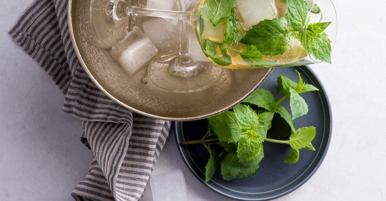 Weinglas mit Eiswürfeln füllen, Minzblätter hinzufügen.