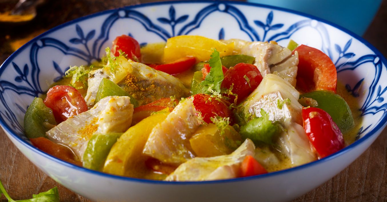 Öl in einem ofenfesten Bräter oder Schmortopf erhitzen, Zwiebel, Knoblauch und Paprikaschoten dazugeben und anbraten. Kokosmilch und Brühe angießen und aufkochen. Fisch und Tomaten zufügen und alles im vorgeheizten Backofen bei 180 °C (Umluft 160 °C) abgedeckt circa 20 Minuten garen.