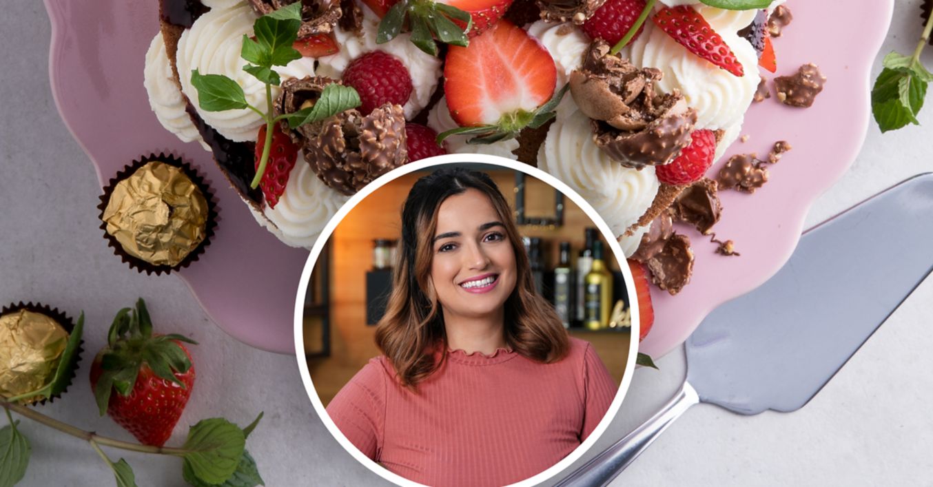 Einen Tortenboden auf eine Tortenplatte legen und mit Heidelbeerkonfitüre bestreichen. Danach Sahnecreme aufspritzen und mit zuvor fein geschnittenen Erd- und Himbeeren garnieren. Mit den restlichen Böden weiterverfahren. Abschließend die Torte mit Pralinenkugeln und frischer Minze dekorieren.