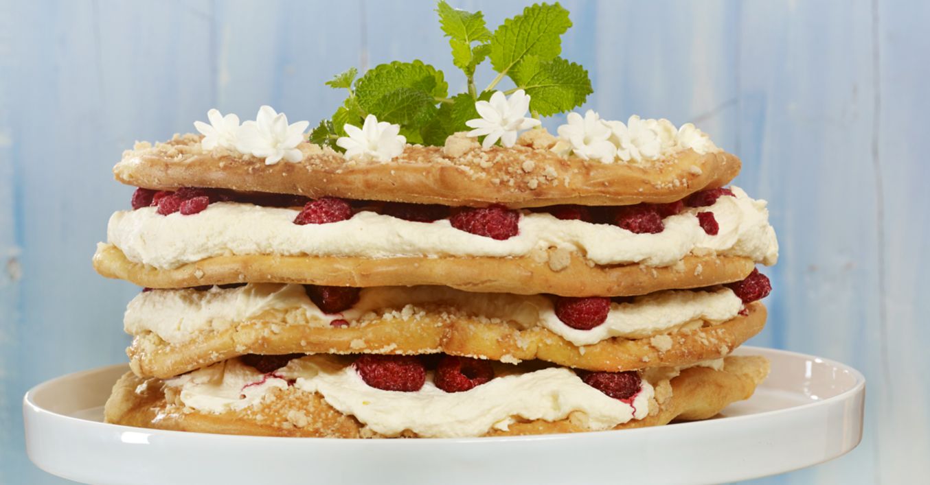 Beeren vorsichtig unter die Creme heben, Creme auf drei Böden verteilen, aufeinander schichten, dabei mit dem Boden ohne Creme abschließen.