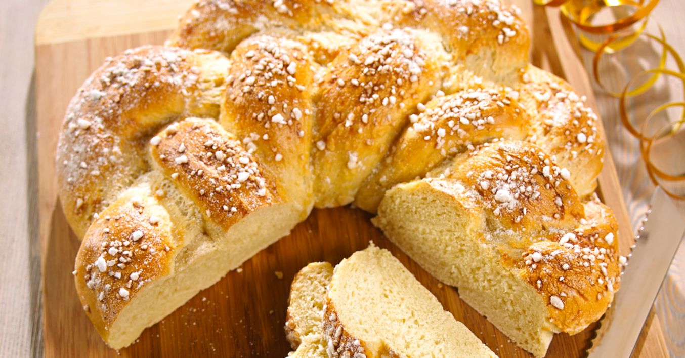 Hefekranz auf einem Kuchengitter auskühlen lassen, in Scheiben schneiden und servieren.