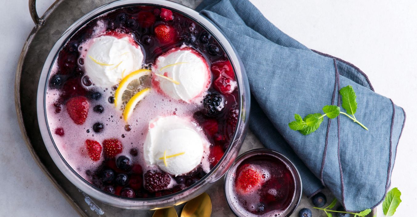 Kurz vor dem Servieren tiefgekühlte Beeren zugeben, mit kaltem Saft und Sekt auffüllen und mit Zitronensorbet servieren.