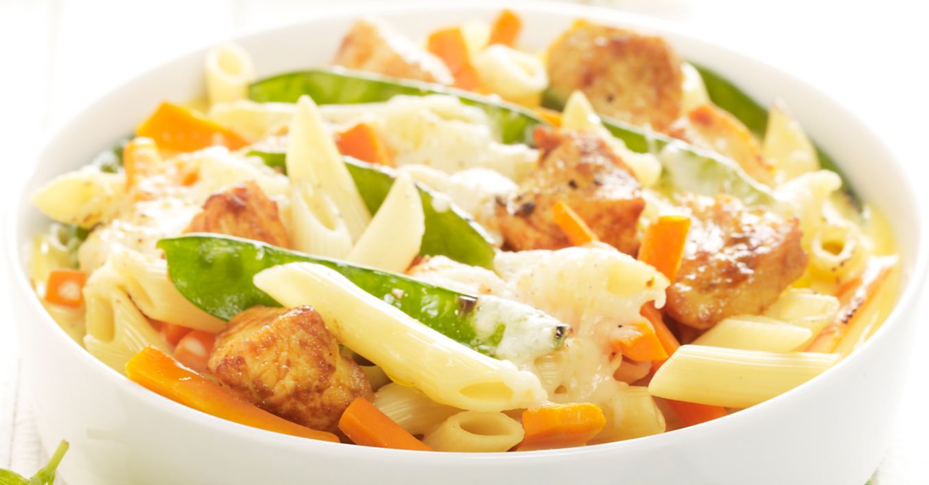 Zuckerschoten waschen und putzen. Möhren schälen, waschen und in Stifte schneiden. Zwiebeln abziehen und Würfeln. Zuckerschoten, Möhren und Zwiebeln zu der Hähnchenbrust geben und andünsten. Mit Nudeln vermischen und in eine Gratinform (24 mal 34 zentimeter) geben.