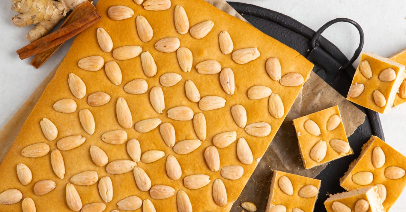 Die Mandeln auf dem Lebkuchen verteilen und ca. 25 Minuten backen (Elektro- und Erdgasbackofen: 180 Grad/Stufe 3, Umluft 160 Grad).