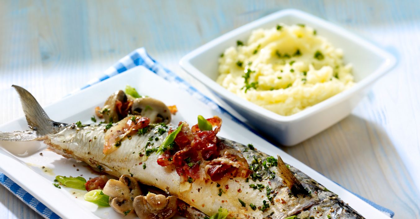 Kartoffeln schälen, waschen, in Stücke schneiden und in Salzwasser circa 20 Minuten garen. Abgießen, mit Milch und Butter grob zerstampfen und mit Salz, Pfeffer und Muskat würzen. Makrelen und Gemüse aus dem Bratschlauch nehmen, mit Kartoffelstampf anrichten, Petersilie überstreuen und servieren.