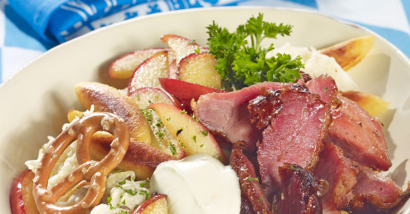 Oktoberfesthaxe mit Schupfnudel-Sauerkrautpfanne und Senfdip