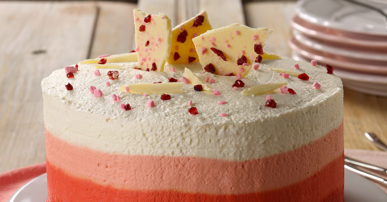 Die angetauten Torten übereinanderstapeln. Dunkelste Sahne mithilfe eines Spritzbeutels an unterster Stelle anbringen, mit den heller werdenden Sahnecremes ebenso verfahren und mit der weißen Creme abschließen. Cremeschichten mit einem Backschaber glattstreichen und die weiße Creme auch auf der Oberfläche verteilen.