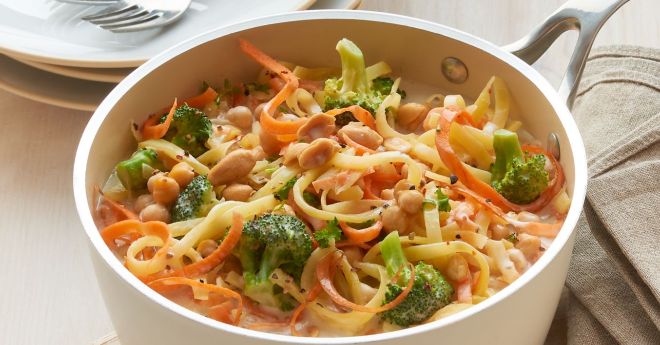 Möhren und Kartoffeln schälen, waschen und mit Hilfe eines Spiralschneiders in dünne Spiralen schneiden. Kichererbsen abtropfen lassen. Brokkoli putzen, in kleine Röschen zerteilen und waschen.