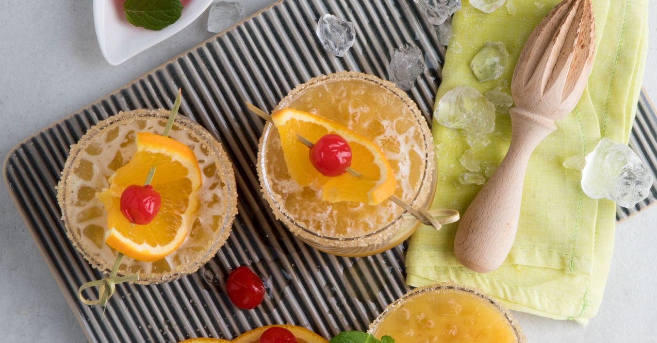 Für den Zuckerrand Zucker und etwas Orangensaft jeweils auf einen kleinen Teller geben, Glas zuerst in Orangensaft und dann in Zucker tauchen.