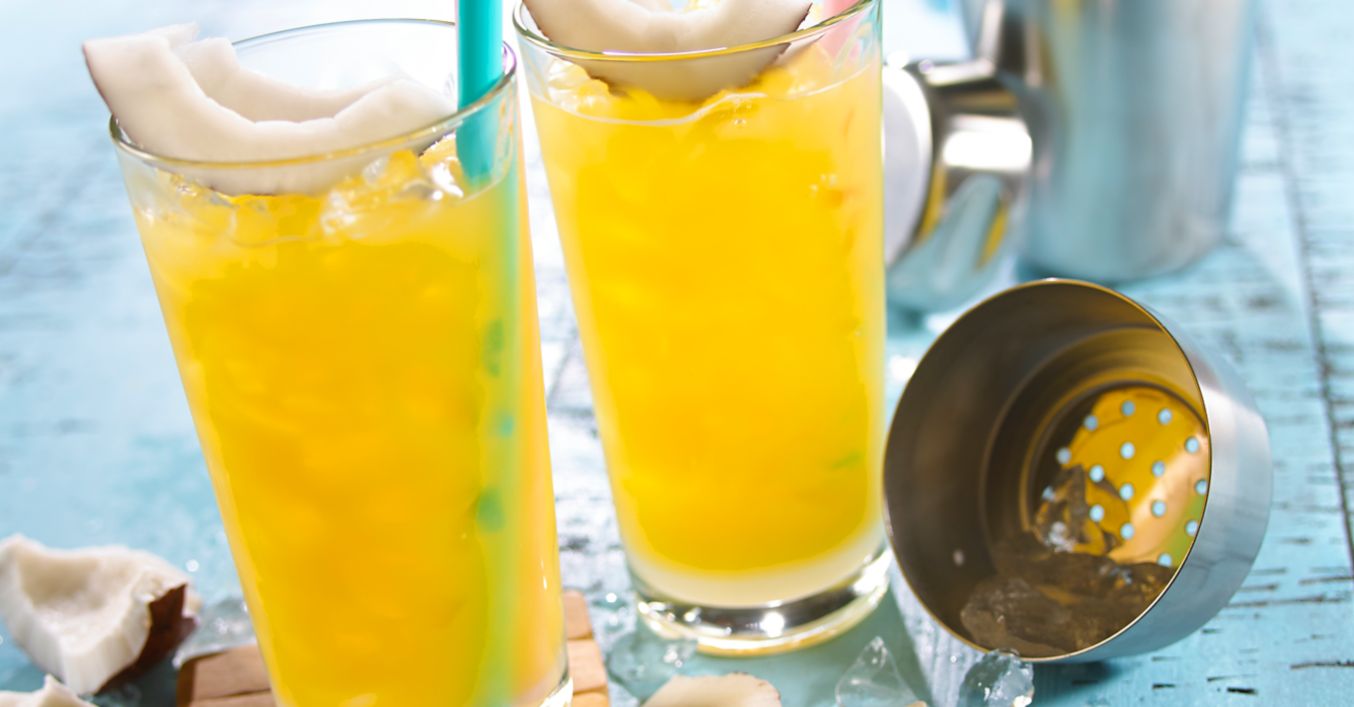 Bier, Orangen- und Ananassaft sowie Kokoslikör oder -sirup mixen.