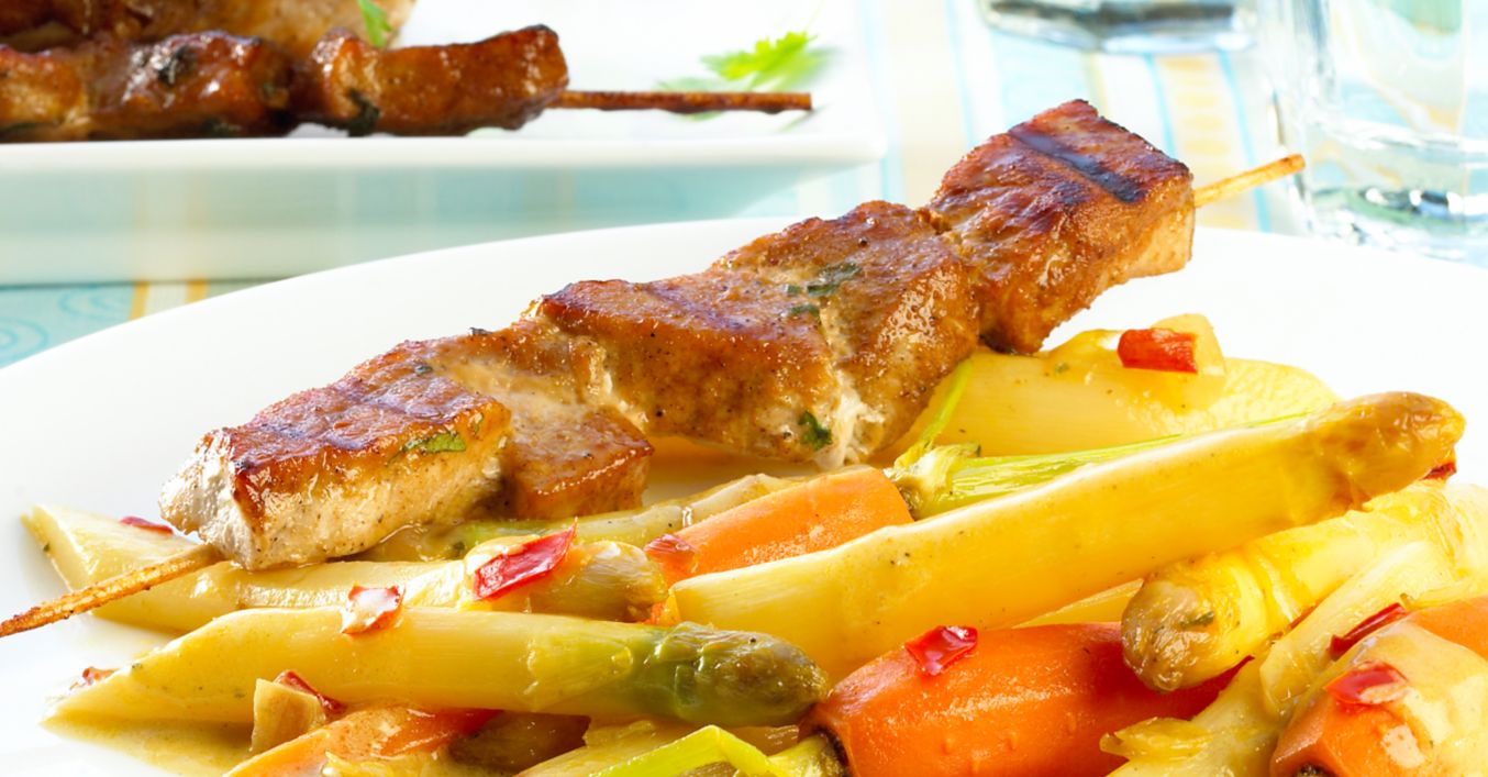 Butter und Öl in einem Topf erhitzen, Zwiebel und Peperoni kurz darin andünsten und Spargel und Möhren zugeben. Mit Zucker bestreuen, kurz mitdünsten, Currypulver unterrühren und Gemüsebrühe angießen. Bei geringer Hitze circa 10 Minuten garen, Kokosmilch zugießen und weitere circa 3 Minuten garen. Mit Limettensaft, Salz und Pfeffer abschmecken und servieren.