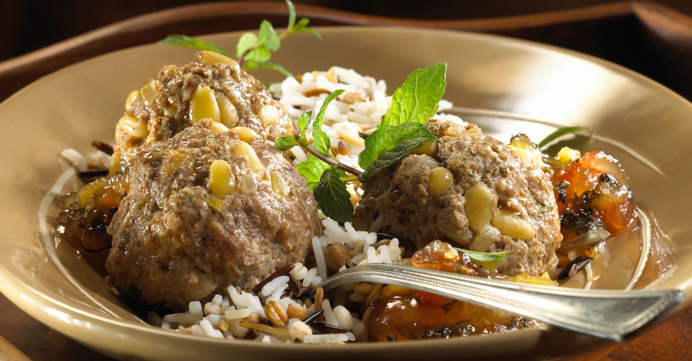 Für die Hackbällchen Öl in einer Pfanne erhitzen. Zwiebel in Würfel schneiden, Knoblauch zerdrücken und im Öl andünsten. Pinienkerne unterheben. Zwiebel-Nuss-Mischung mit Hackfleisch vermengen, mit Koriander, Kardamon, Zimt, Salz und Chilipulver würzen.