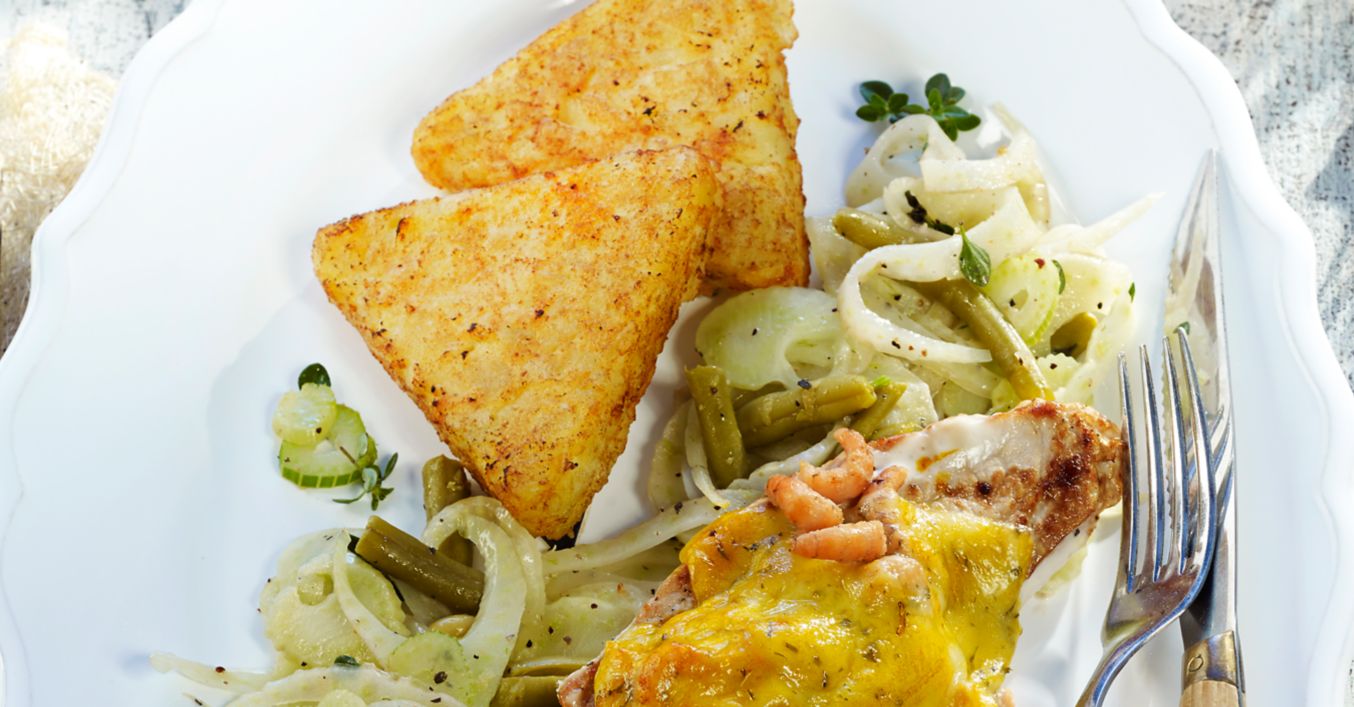 Bohnen abtropfen lassen, dazugeben und kurz mit erhitzen. Fenchelgemüse mit Senf, Salz und Pfeffer abschmecken, mit Schnitzeln und Rösti auf Teller anrichten und servieren.