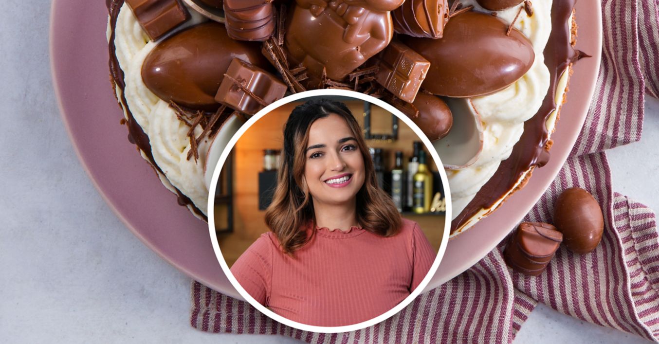 Die Schokoladenhasen in die Mitte der Torte stellen. Schokoriegel als weitere Dekoration auf Torte platzieren.