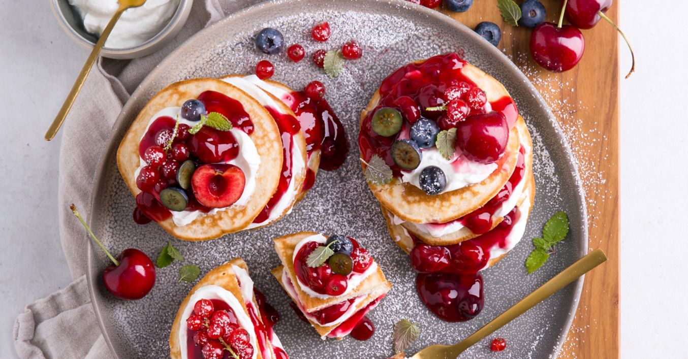 Rote Grütze auf dem Quark verteilen und jeweils 3 Pan Cakes übereinander schichten.