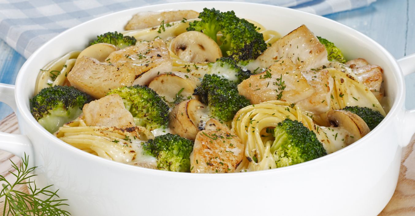 Spaghetti, Pangasius, Brokkoli und Champignons in einer Gratinform (20 x 30 Zentimeter) verteilen.