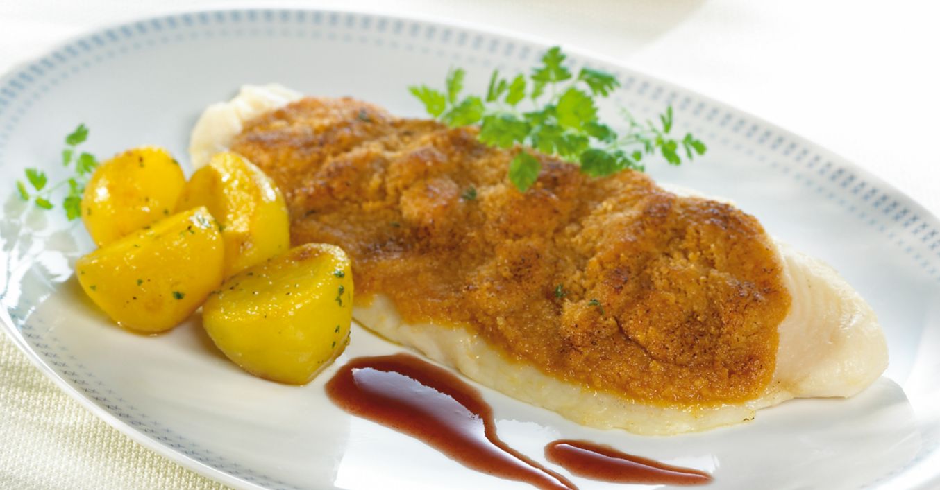 Für die Kruste Spekulatius fein zerbröseln, weiche Butter schaumig schlagen, Spekulatius und Semmelbrösel dazugeben, mit Salz und Pfeffer würzen, auf dem Fisch verteilen und im vorgeheizten Backofen bei 200 Grad ca. 15 Minuten (Gas: Stufe 4, Umluft: 180 Grad) garen.