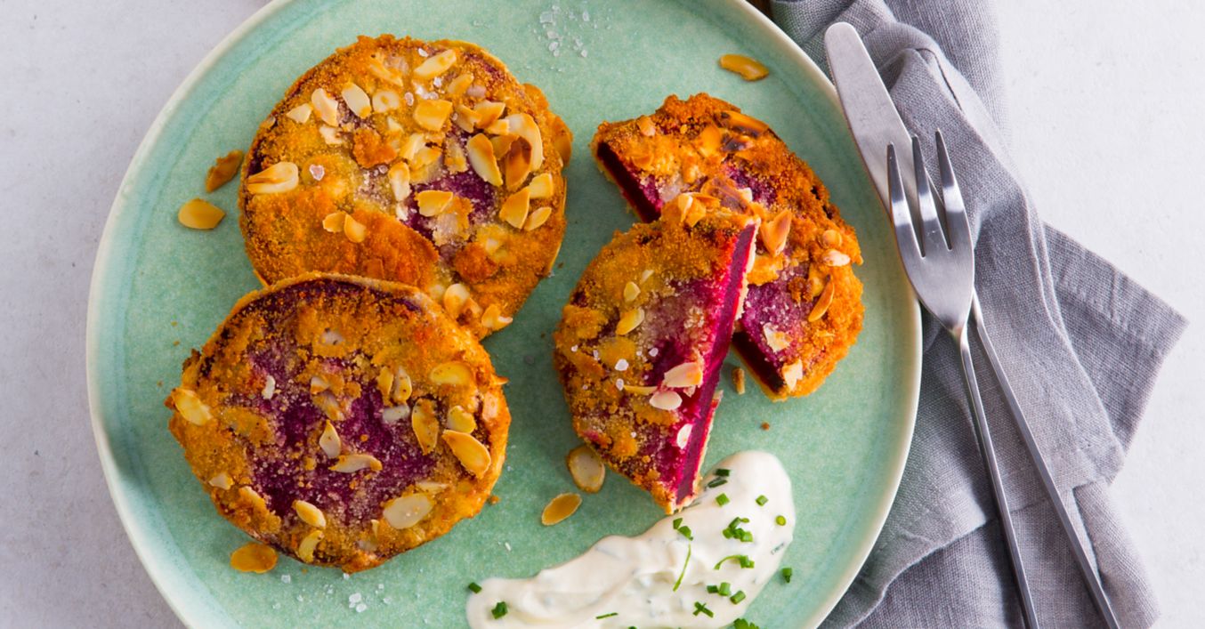 Rote Bete in circa 2 Zentimeter dicke Scheiben schneiden und in Mehl wenden. Eier und Salz verquirlen. Paniermehl und Mandeln vermischen. Rote Bete erst in Ei und anschließend in der Paniermehlmischung wenden und in erhitztem Öl von beiden Seiten circa 3 bis 4 Minuten goldbraun braten.