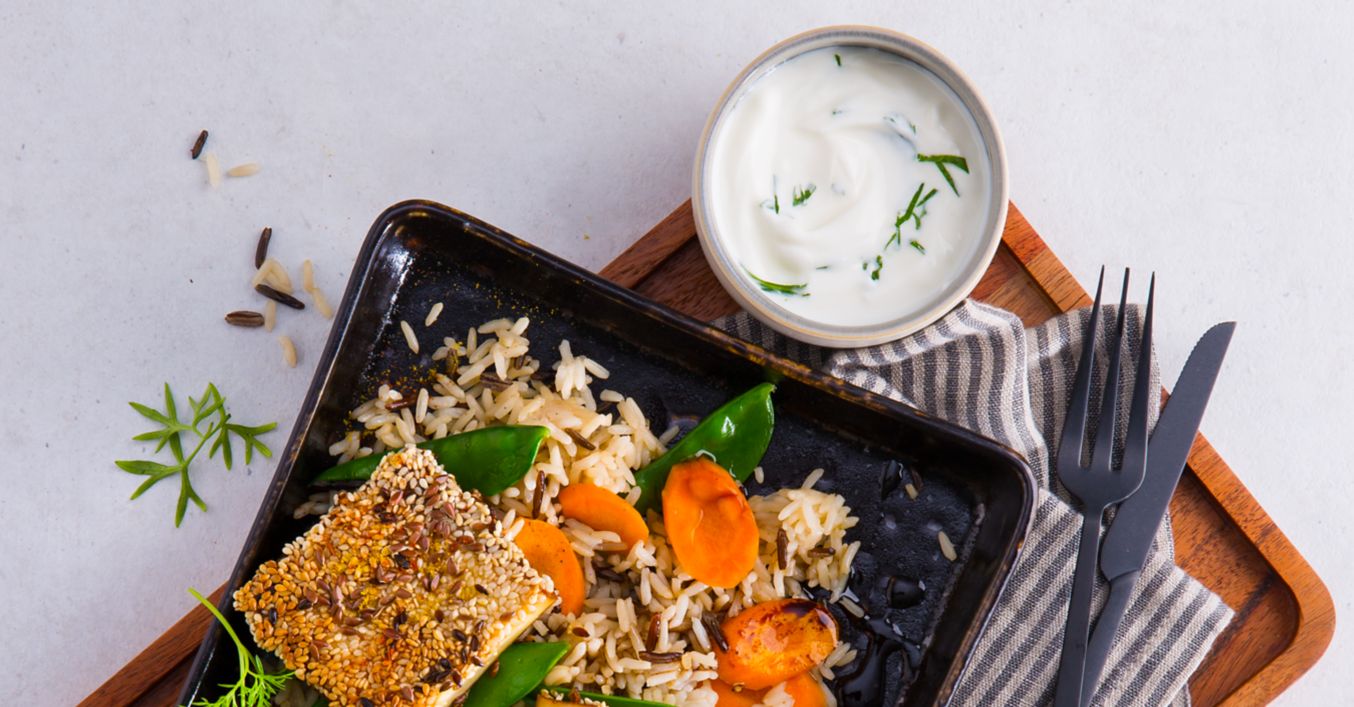 Zuckerschotenreis, Tofu und Joghurt auf Teller anrichten und nach Wunsch mit Koriander garniert servieren.