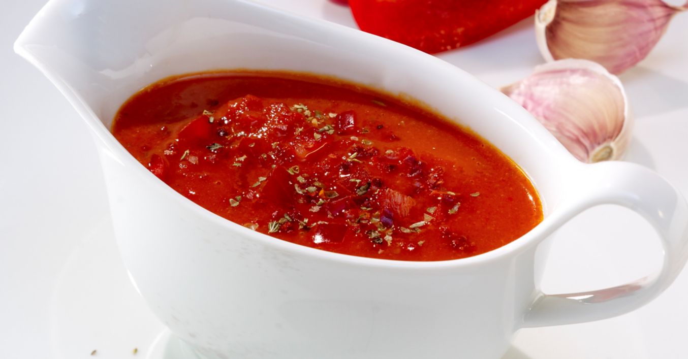 Honig und Paprikawürfel einrühren und Paprikasoße mit Chiliflocken, Majoran, Salz und Pfeffer würzen.