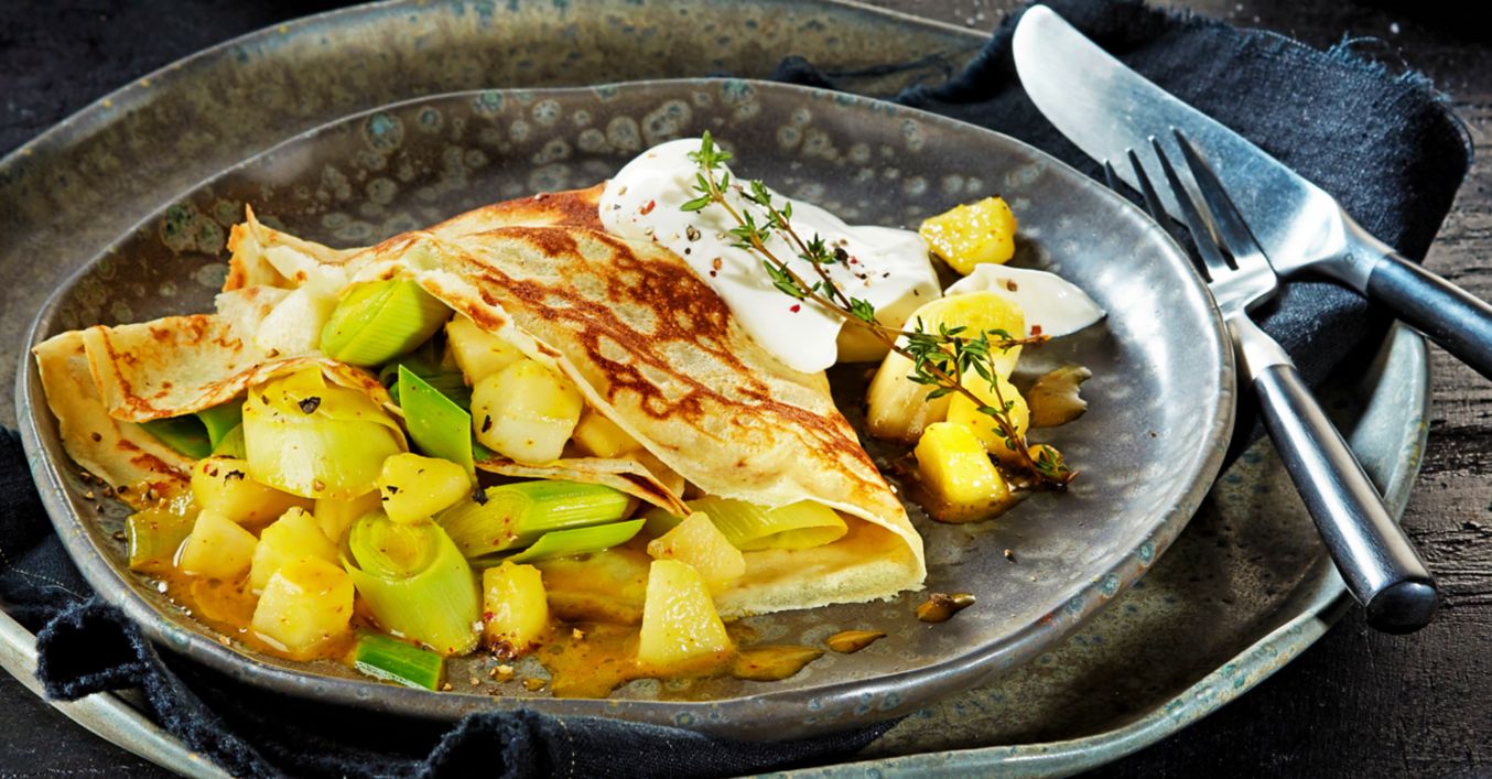 Parmesan-Crêpes mit Lauch, Birne und Schmand