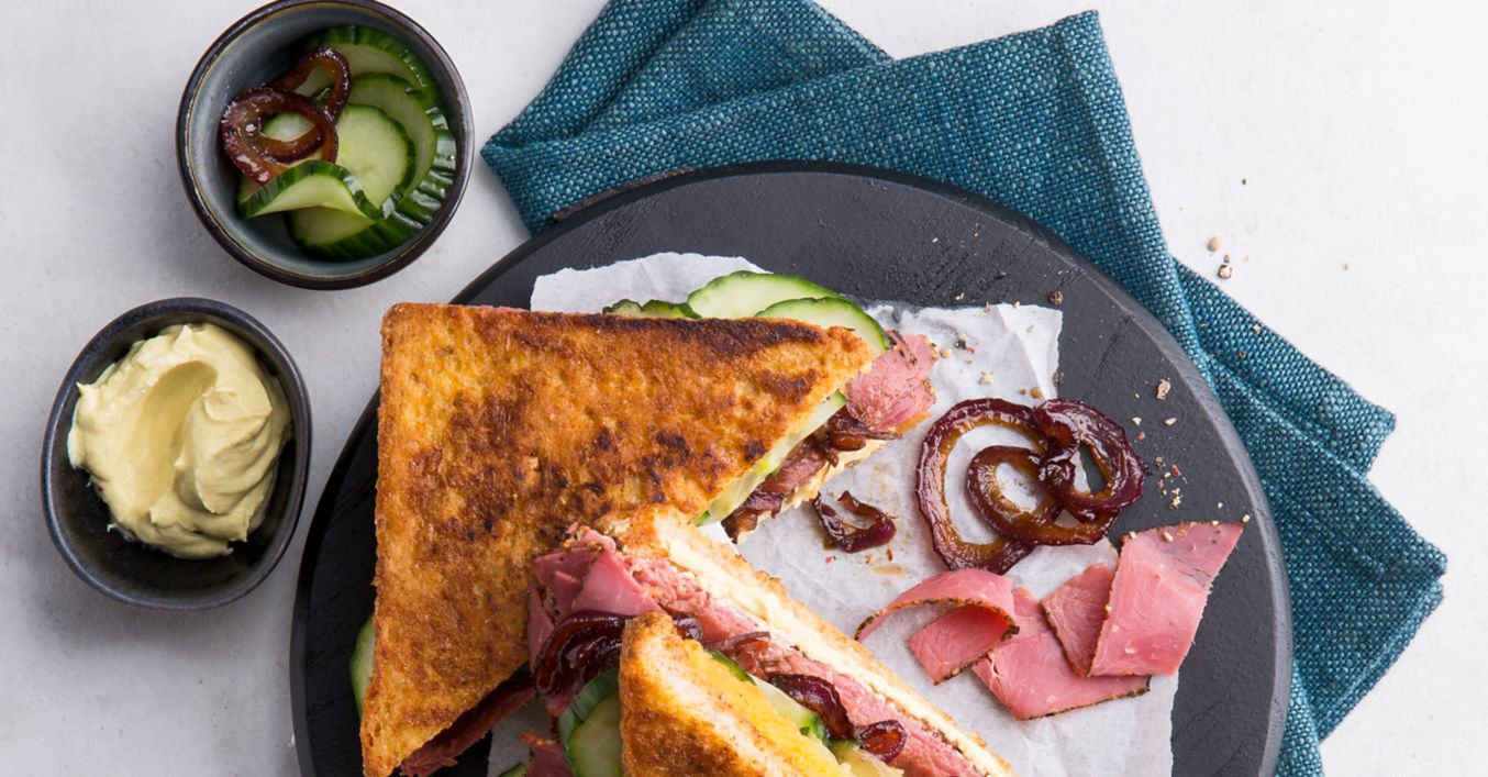 Frischkäse mit Senf verrühren, die unteren Toastbrotscheiben damit bestreichen und mit Pastrami belegen. Zusammenklappen, andrücken und diagonal aufschneiden.