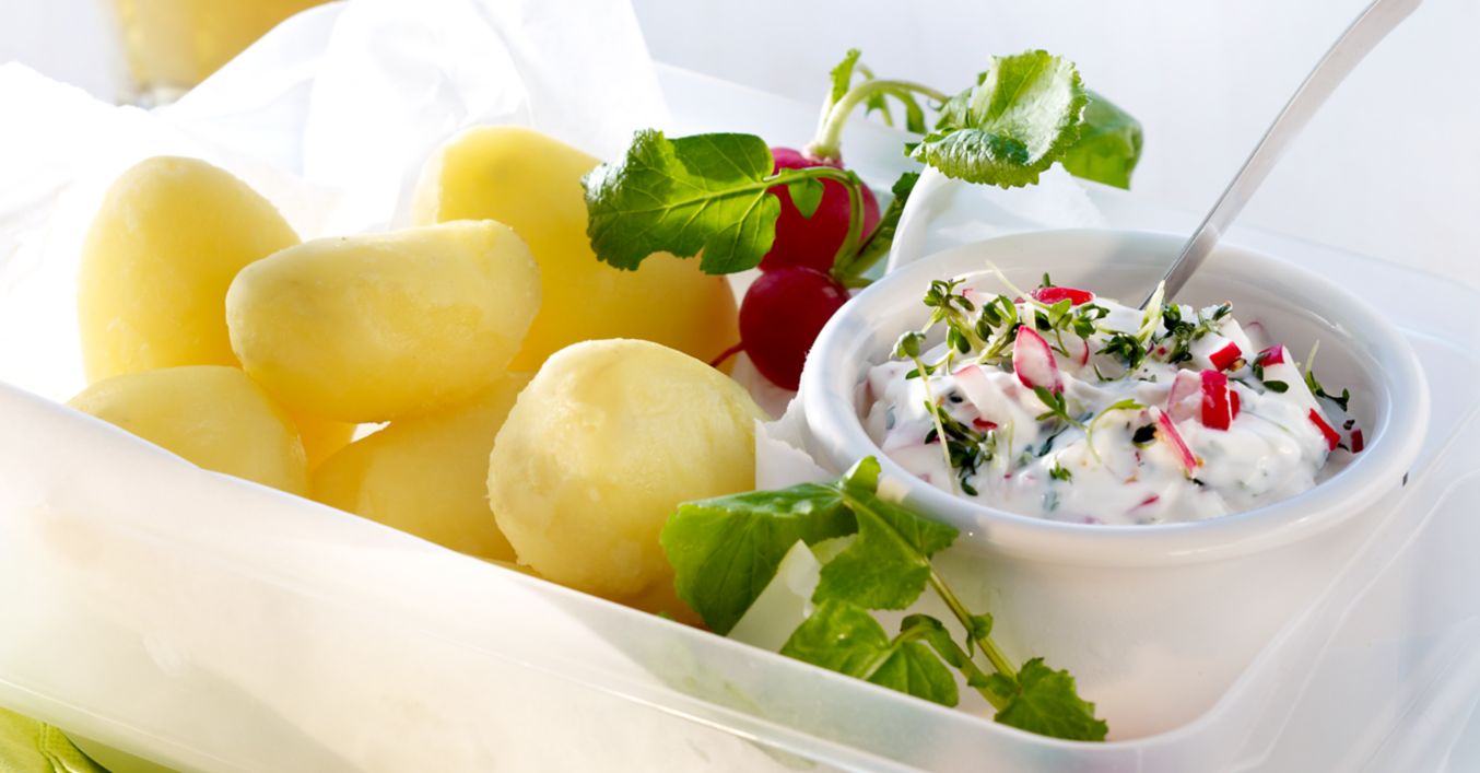 Kartoffeln pellen und zum Mitnehmen in eine Schale packen. Dip separat einpacken.