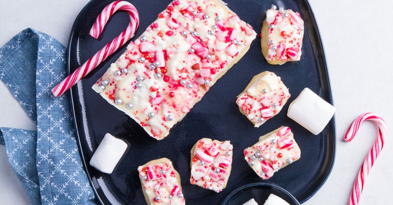 Zuckerstangen hacken, Marshmallows klein schneiden, mit den Zuckerstreuseln auf dem Fudge verteilen, etwas unterheben, glatt streichen und mindestens 1 Stunde kaltstellen.
