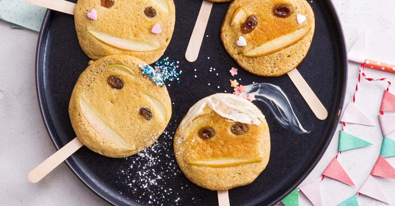 Auf die gleiche Weise 11 weitere Pfannkuchengesichter ausbacken. Fertige Pfannkuchen auskühlen lassen und jeden Pfannkuchen auf einen Eisstiel stecken.