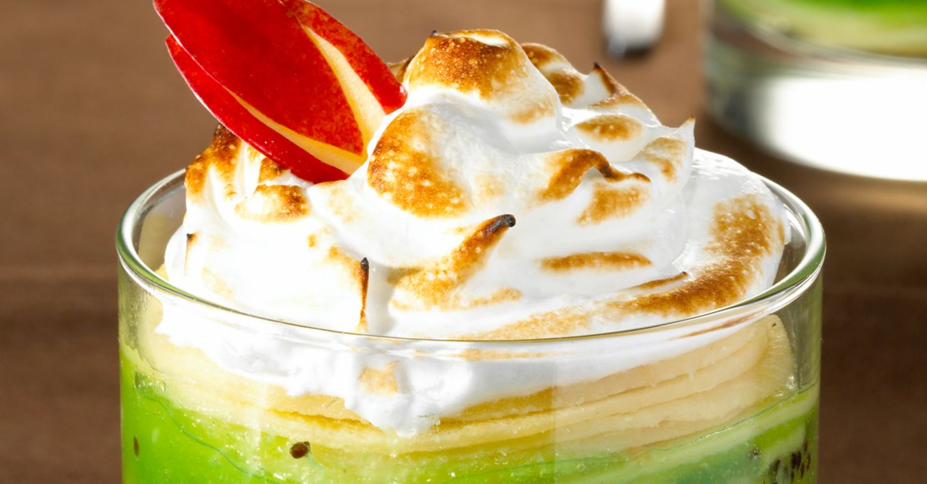 Für das Baiser Eiweiß mit Zucker und Salz sehr steif schlagen. Mit einem Dessertglas kleine Kreise aus den Pfannkuchen ausstechen und abwechselnd mit dem Kiwigelee in Dessertgläser schichten. Etwas Baisermasse als Topping obenauf geben und unter dem Grill kurz anbräunen. Nach Wunsch mit Apfelspalten garnieren und servieren.