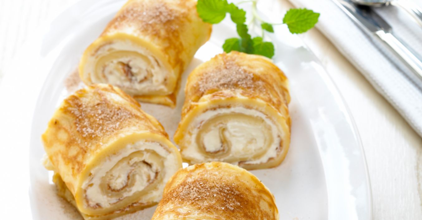 Für die Füllung Äpfel fein raspeln. Magerquark mit Frischkäse glattrühren, Apfelraspel unterheben und mit Vanillezucker abschmecken. Pfannkuchen mit der Apfel-Quark-Masse bestreichen, nach Belieben mit Zimt bestreuen, aufrollen, in Schnecken schneiden und mit Himbeeren garniert servieren.