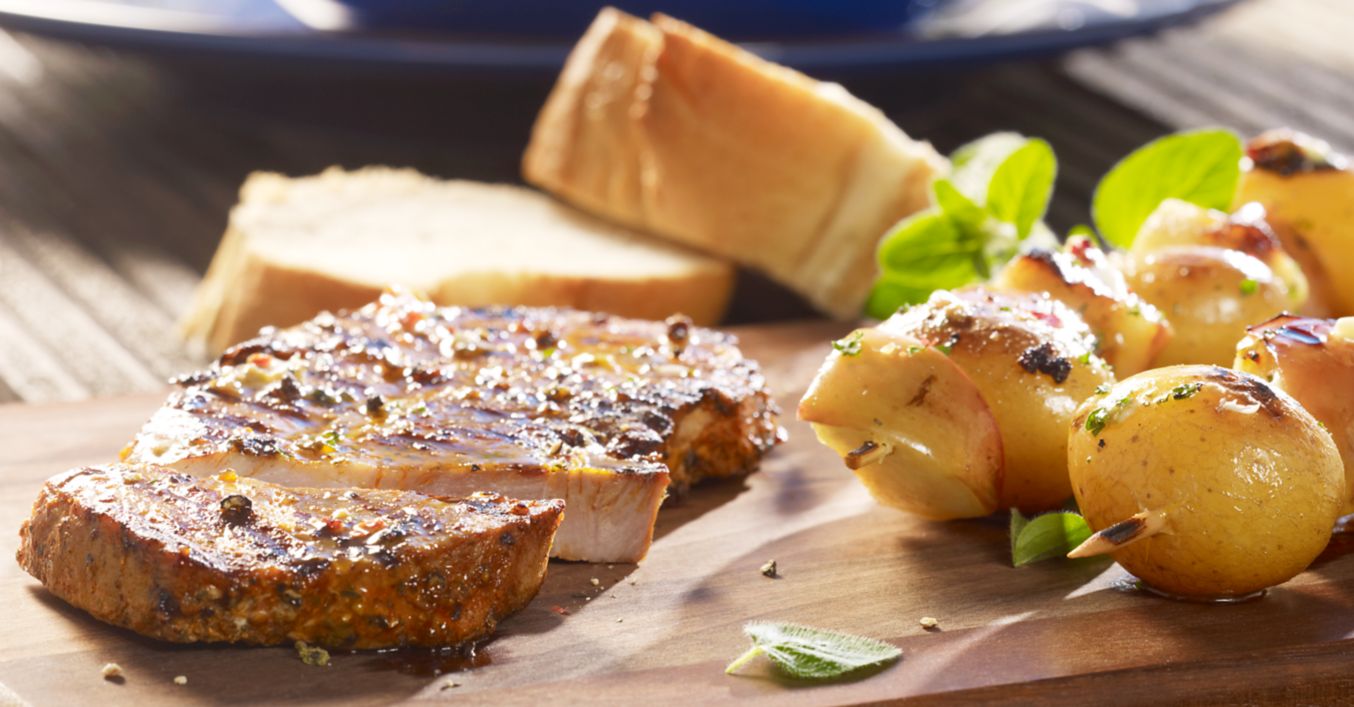 Pfefferhüftsteaks mit Kartoffel-Apfel-Spießen