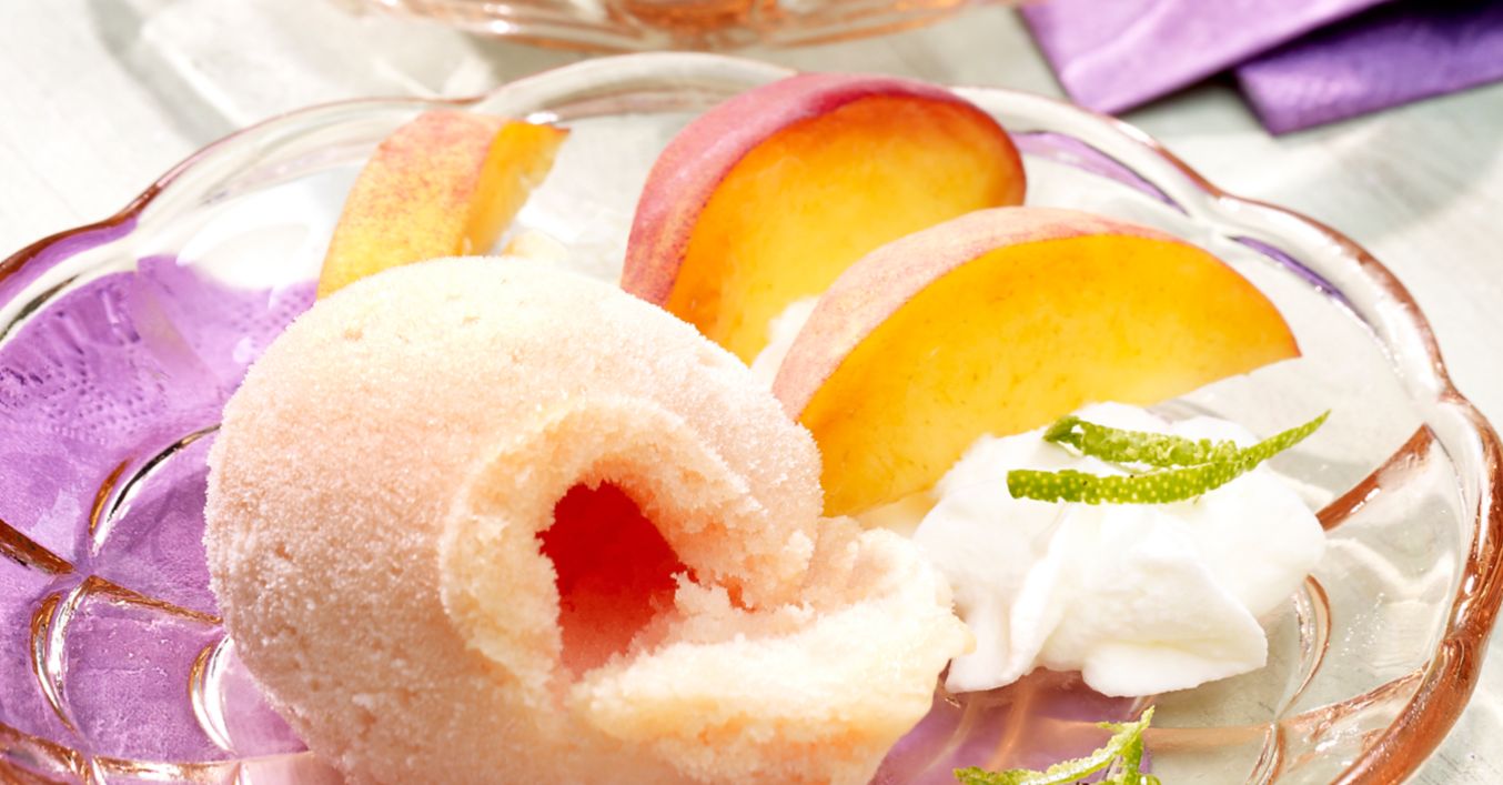 Zucker mit 100 ml Wasser aufkochen und abkühlen lassen. Pfirsichpüree in eine flache Form geben und ca. 2 Stunden in das Tiefkühlfach stellen. Nach 2 Stunden Zuckersirup auf das Sorbet geben, Sorbet einmal durchrühren und über Nacht im Tiefkühlfach gefrieren lassen. Zwischendurch noch einmal mischen. Sorbet mit frischer Minze und nach Wunsch mit Sahne und Pfirsichspalten garniert servieren.