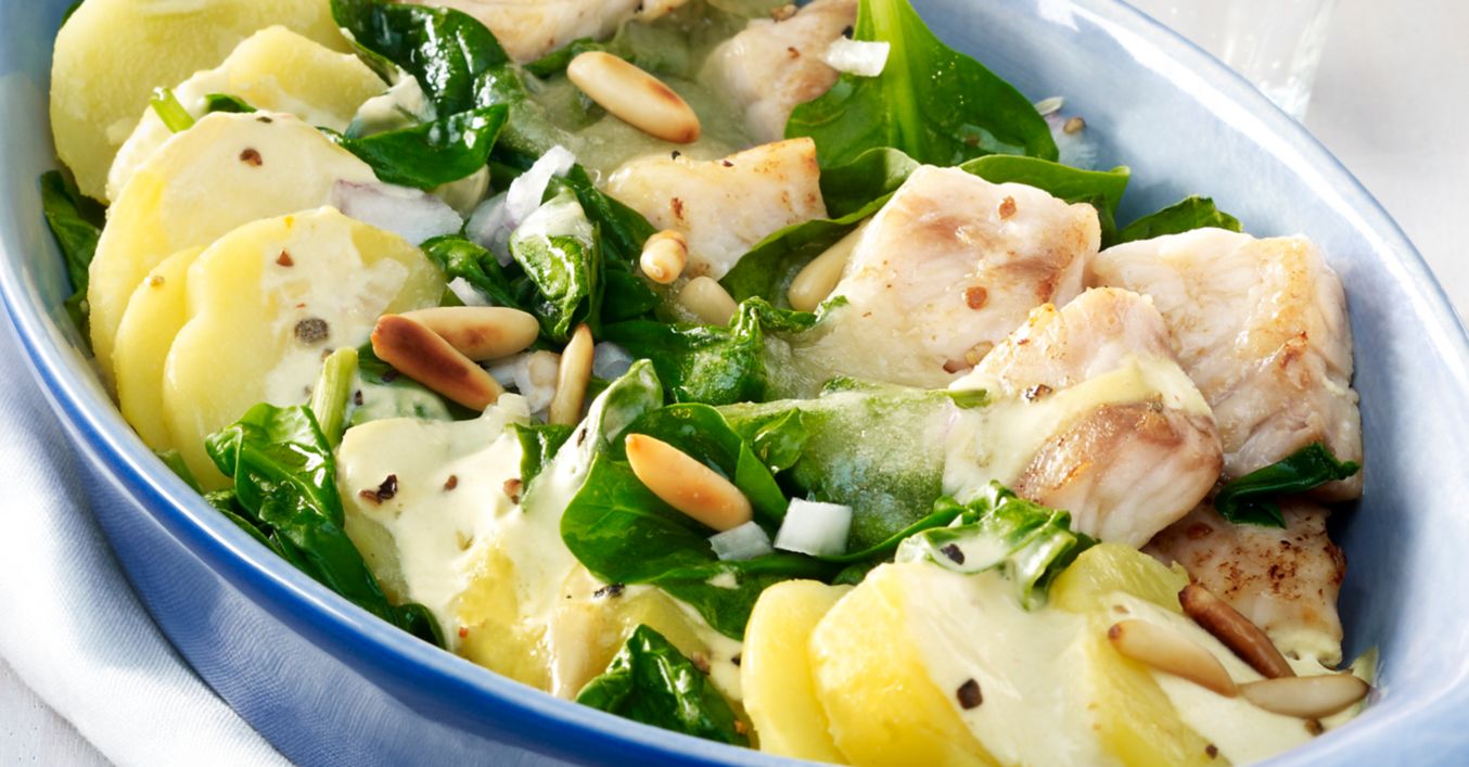 Kartoffeln in Scheiben schneiden. Fischstücke, Kartoffeln und Spinat in eine Auflaufform (23 mal 23 Zentimeter) oder in 4 Portionsförmchen geben. Schmand und Senf verrühren, mit Salz und Pfeffer würzen und auf dem Auflauf verteilen.