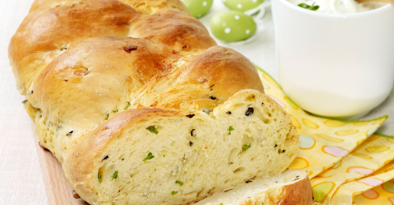 Salz, Ei, Öl und weitere 100 Milliliter Wasser dazugeben, zu einem geschmeidigen Teig verkneten und weitere circa 20 Minuten gehen lassen. Oliven in kleine Würfel schneiden, Kräuter hacken, Knoblauch abziehen und zerdrücken, alles unter den Teig kneten und den Teig in 3 Portionen teilen. Zu langen Strängen formen und daraus einen Zopf flechten. Den Zopf auf ein mit Backpapier ausgelegtes Backblech legen und weitere circa 15 Minuten gehen lassen.