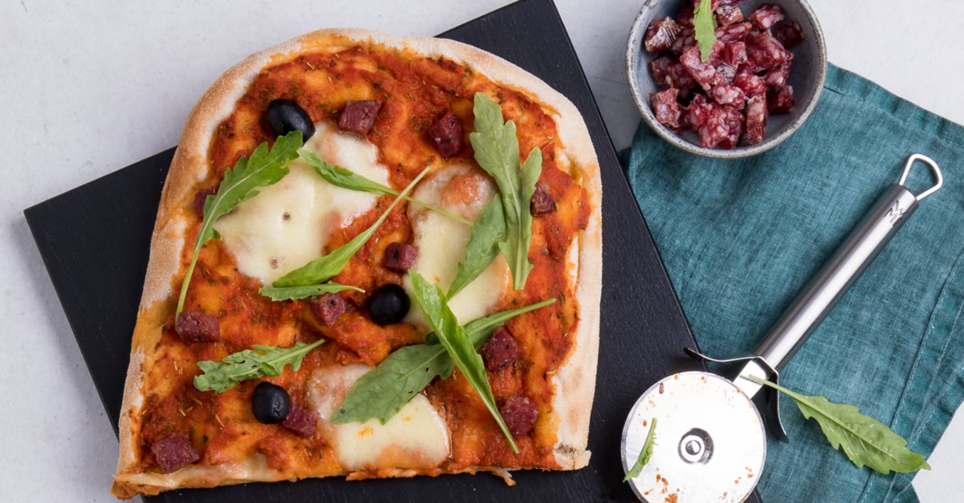 Mozzarella in Scheiben und Salami in Würfel schneiden, dann mit Oliven auf der Pinsa verteilen.